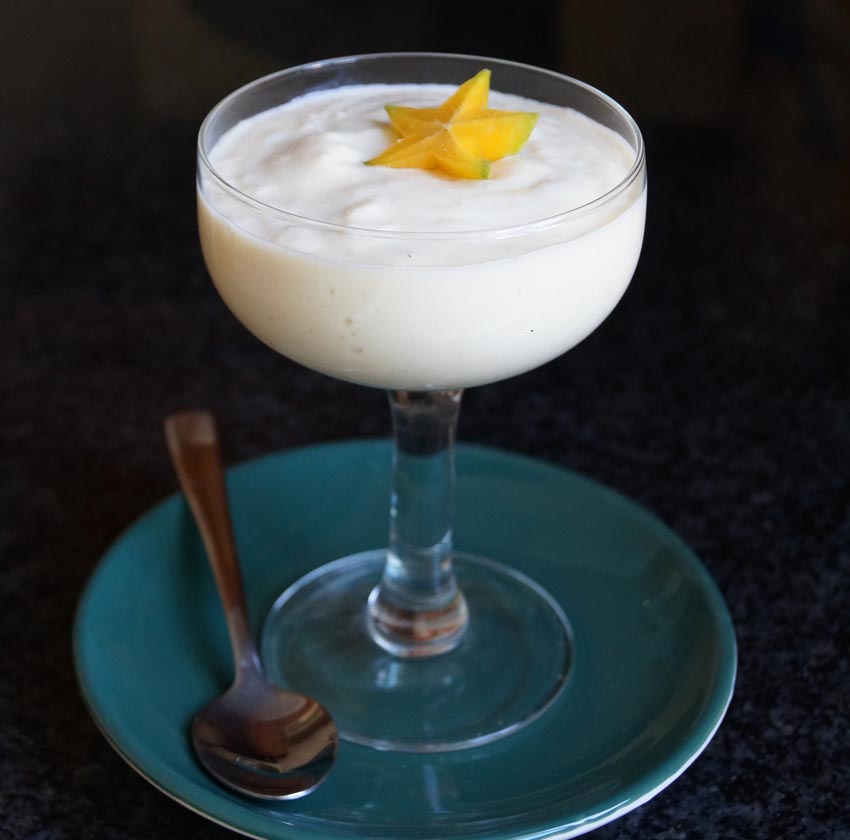 As simple as the mousse recipe: Add all the ingredients to a food processor or use a stick blender, pulse the mixture together until smooth, transfer to little dessert cups and chill for 30 minutes. Pop a slice of star fruit on top to garnish.