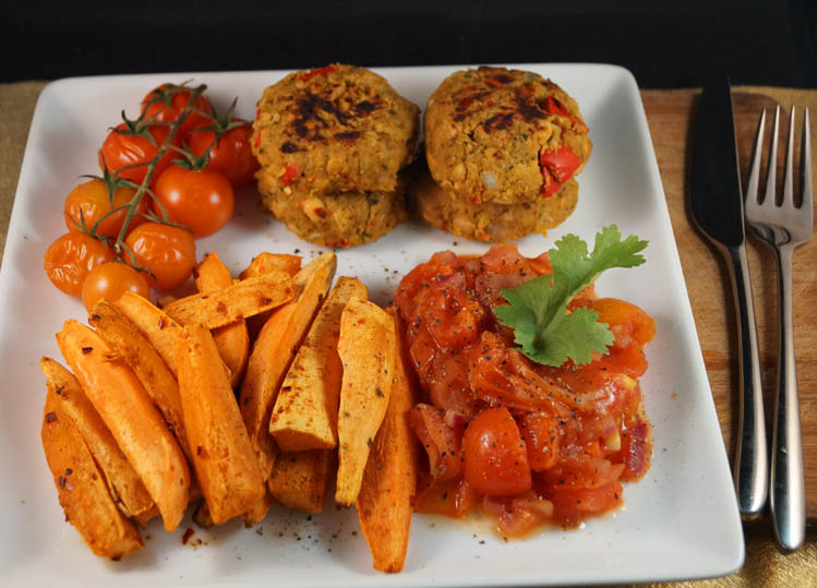 Chilli Falafel with Paprika Sweet Potato Wedges and a Cherry Tomato Chutney (vegan & gluten free)