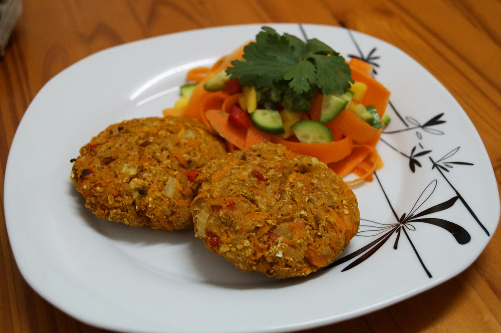 Curried Veggie Burgers served with Mango Salad and a Cucumber & Mint dressing