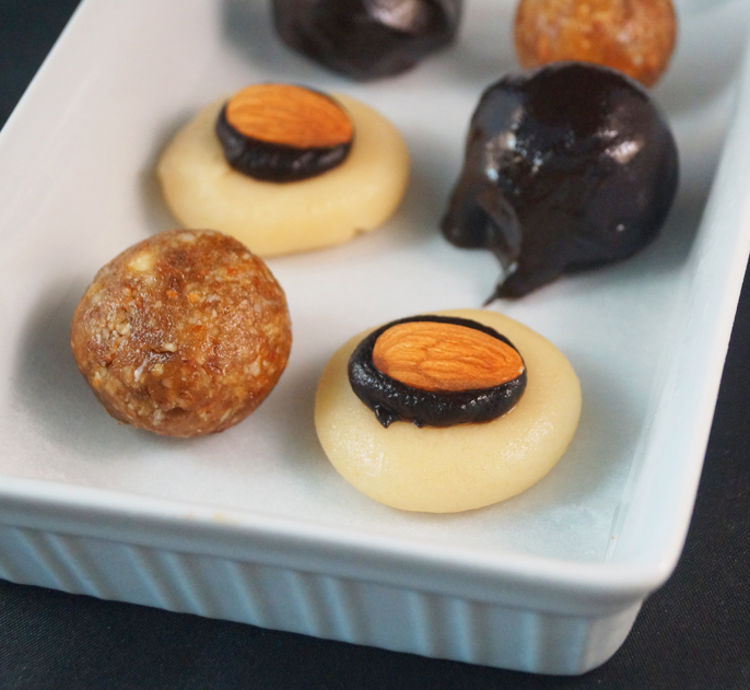 1. For the truffles, add all the ingredients (apart from chocolate) into a food processor (or use a stick blender), then take 1/2 tbsp of mixture and roll into 9 balls and place on a plate lined with parchment paper. Melt the chocolate in a bain marie and then roll 6 (or all 9 if you melt and extra 10g of chocolate) of the truffles into the chocolate and pop back on the parchment then pop all 9 in the freezer for 15 minutes to set.
