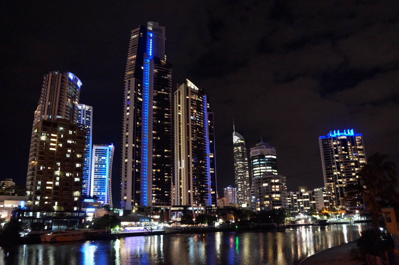 Patting the sand from our trousers and emptying it from our shoes, we headed back over to Chevron Island to the apartment and we saw Surfers begin to light up with the hotels and apartment blocks all illuminated and the reflection shimmering in the water, to me, it was just incredibly beautiful and a magical place to be!