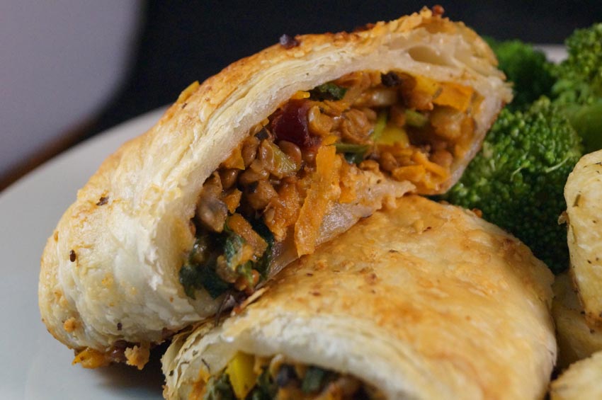 - Spoon the mushroom and lentil mixture onto the pastry, compact it down with your fingers, so you have a nice long strip of the filling, I started the mixture at the edge closest to me and I left a 2 inch space at the opposite end of the pastry so I could roll it properly.