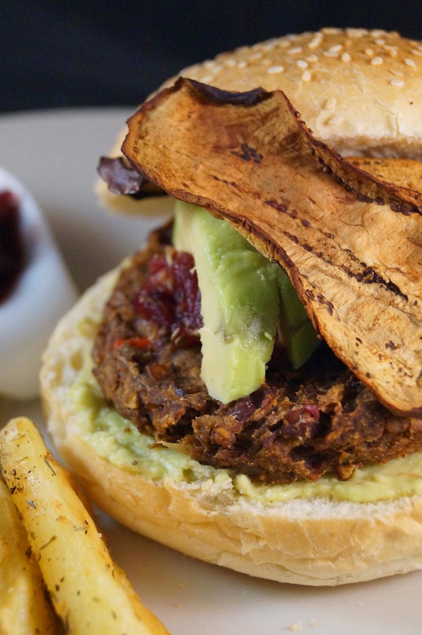 Mexican Veggie Burger with Sliced Avocado, Aubergine Bacon & Red Onion Chutney (vegan & gluten free)