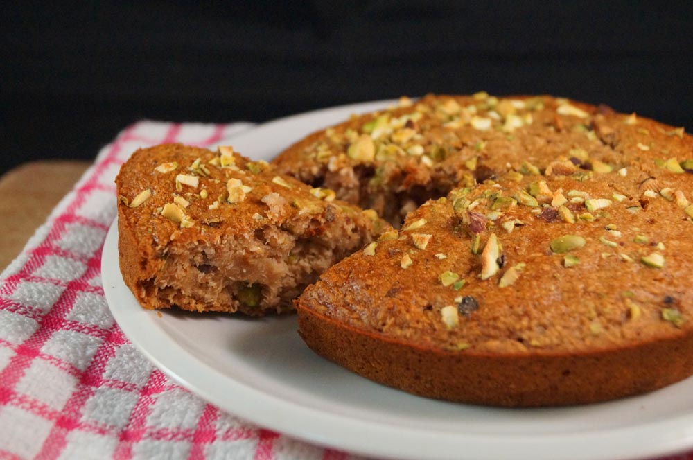 Pour into the cake tin and smooth the top so it’s all even, sprinkle over the chopped pistachios and bake for 25 – 30 minutes until a skewer comes out clean. Leave to cool and enjoy as dessert or with a nice cup of afternoon tea!