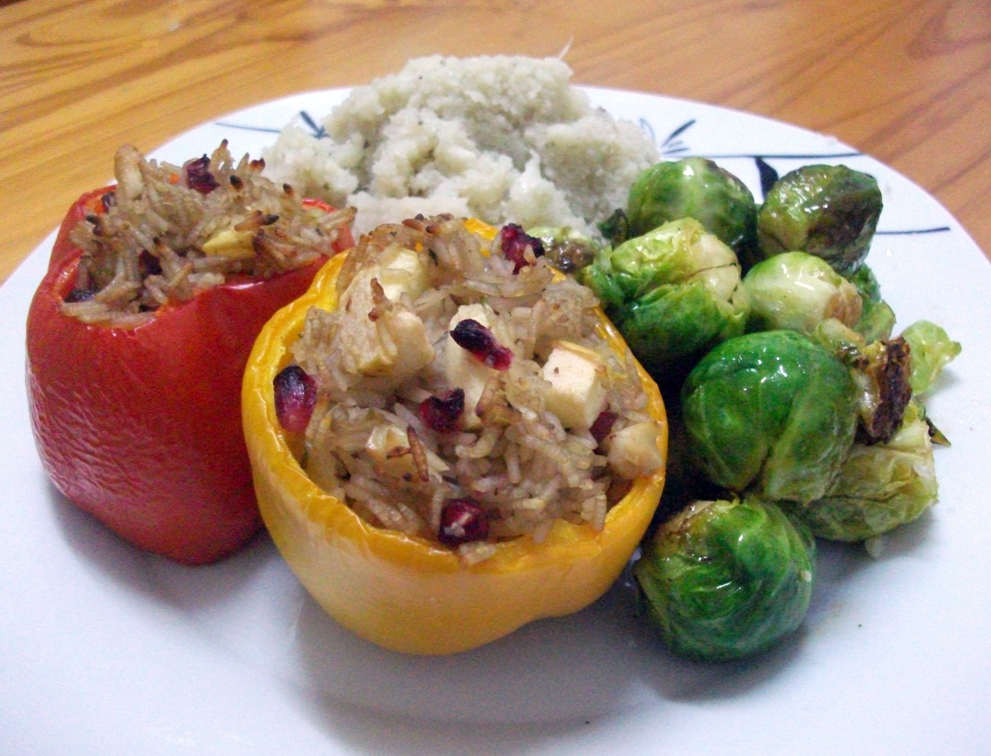 Roasted Peppers stuffed with Fruit & Nut Rice served with Peppered Cauliflower Mash & Caramelized Brussel Sprouts