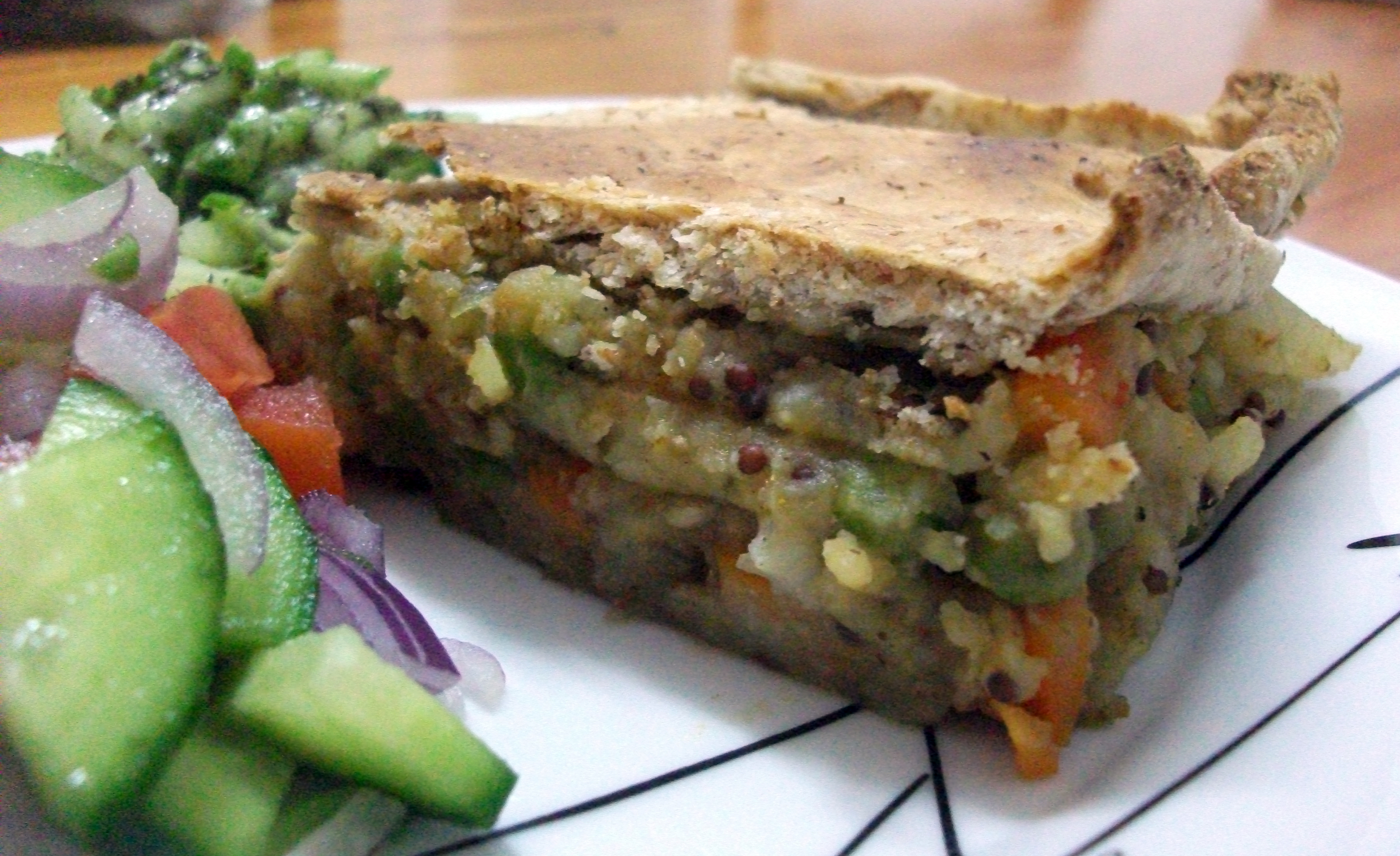 Samosa Pie served with red onion & tomato salad and a minty cucumber side