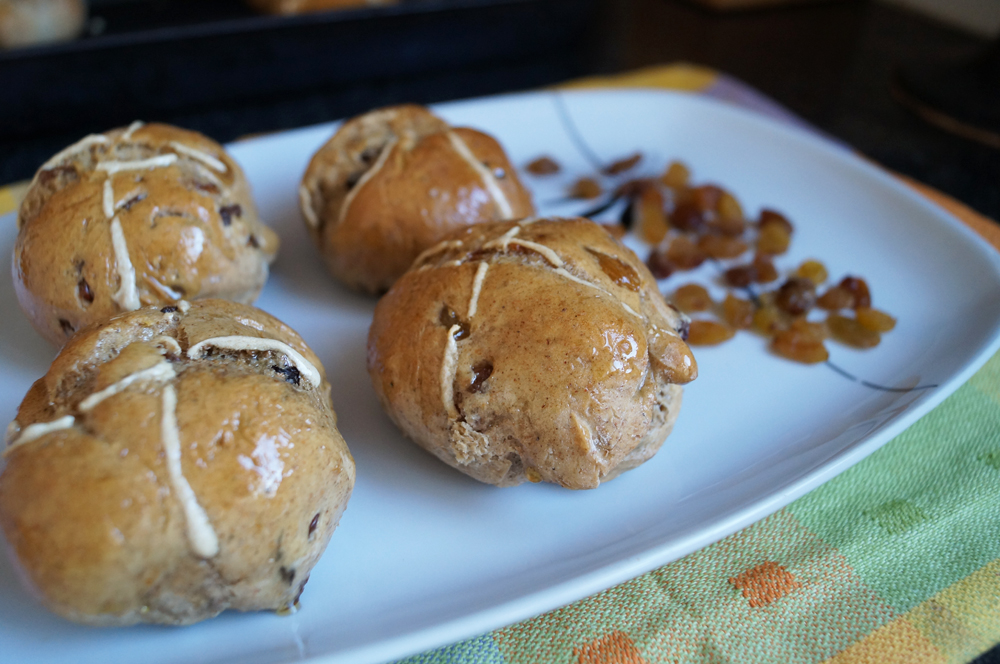 6. The dough should have increased in size again so remove from bowl and separate into 8 small balls, flatten slightly with your palm and pop on a lightly oiled baking tray , then prepare the “cross” mixture by mixing together the buckwheat, water and vanilla and popping into a piping bag, then pipe the mixture into a cross design on each bun and then place in the oven for 20 – 25 minutes until golden and firm to the touch.