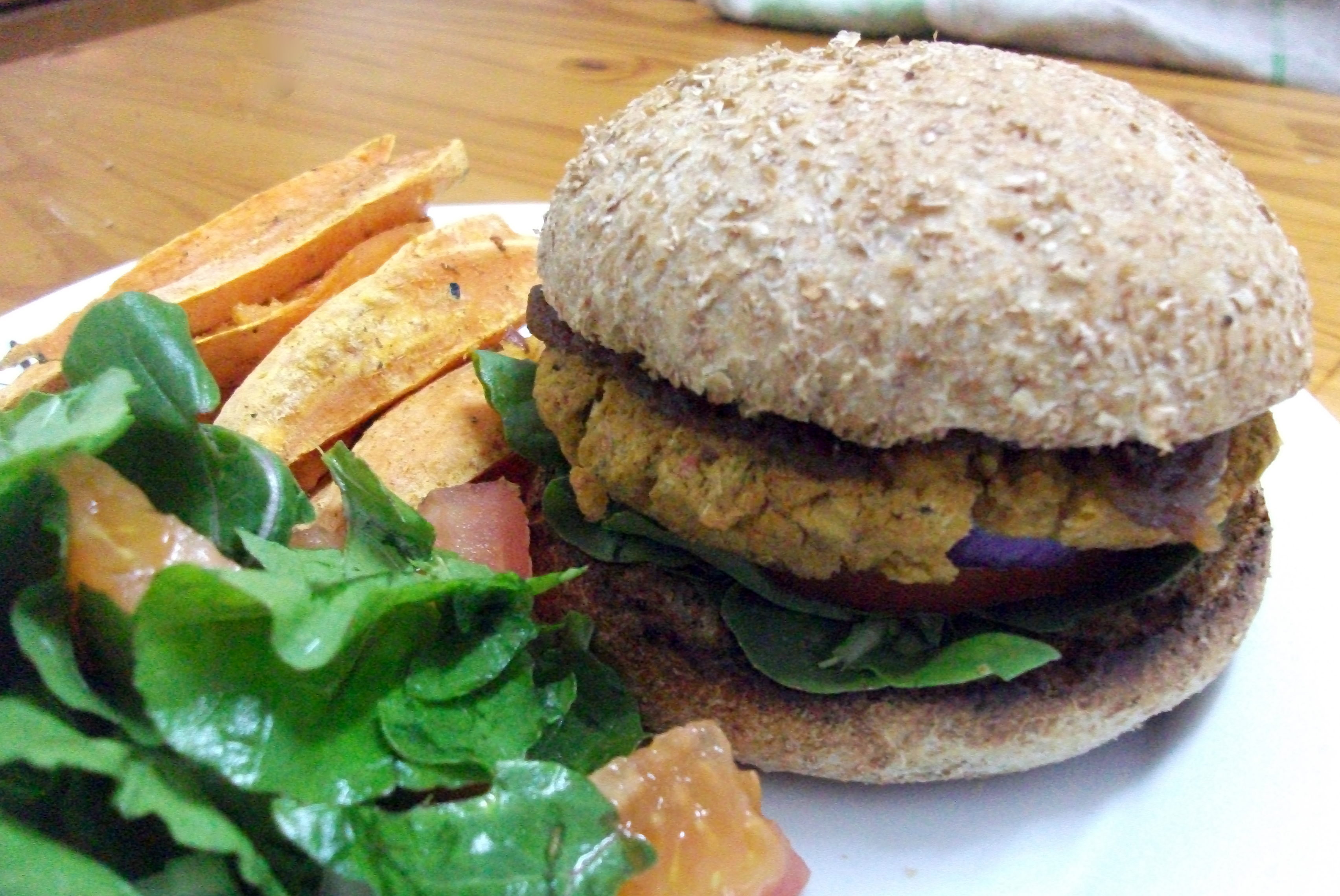 4. Remove from heat and serve in a burger bun with the satay sauce, some rocket and tomato and a side of sweet potato wedges.