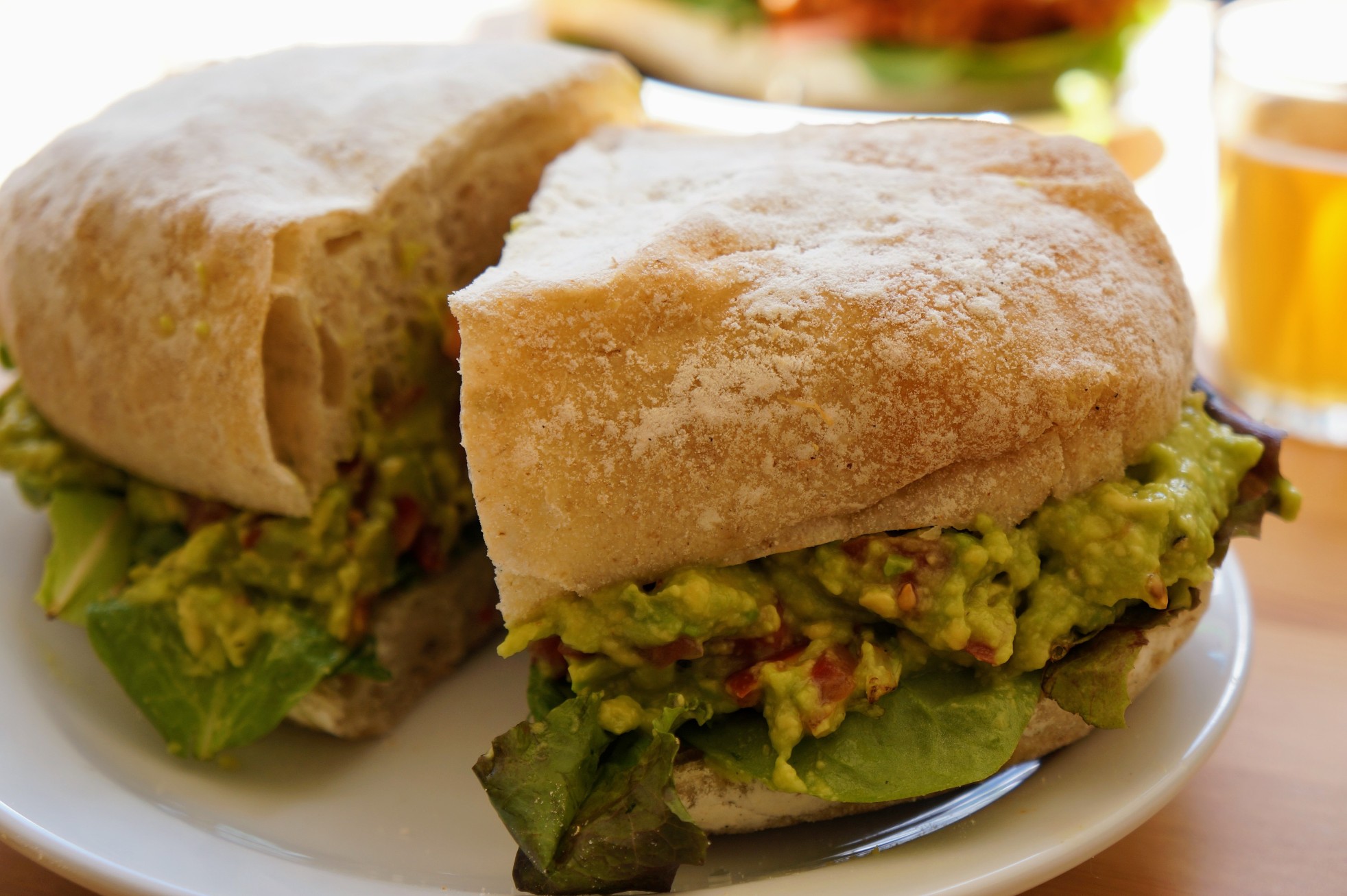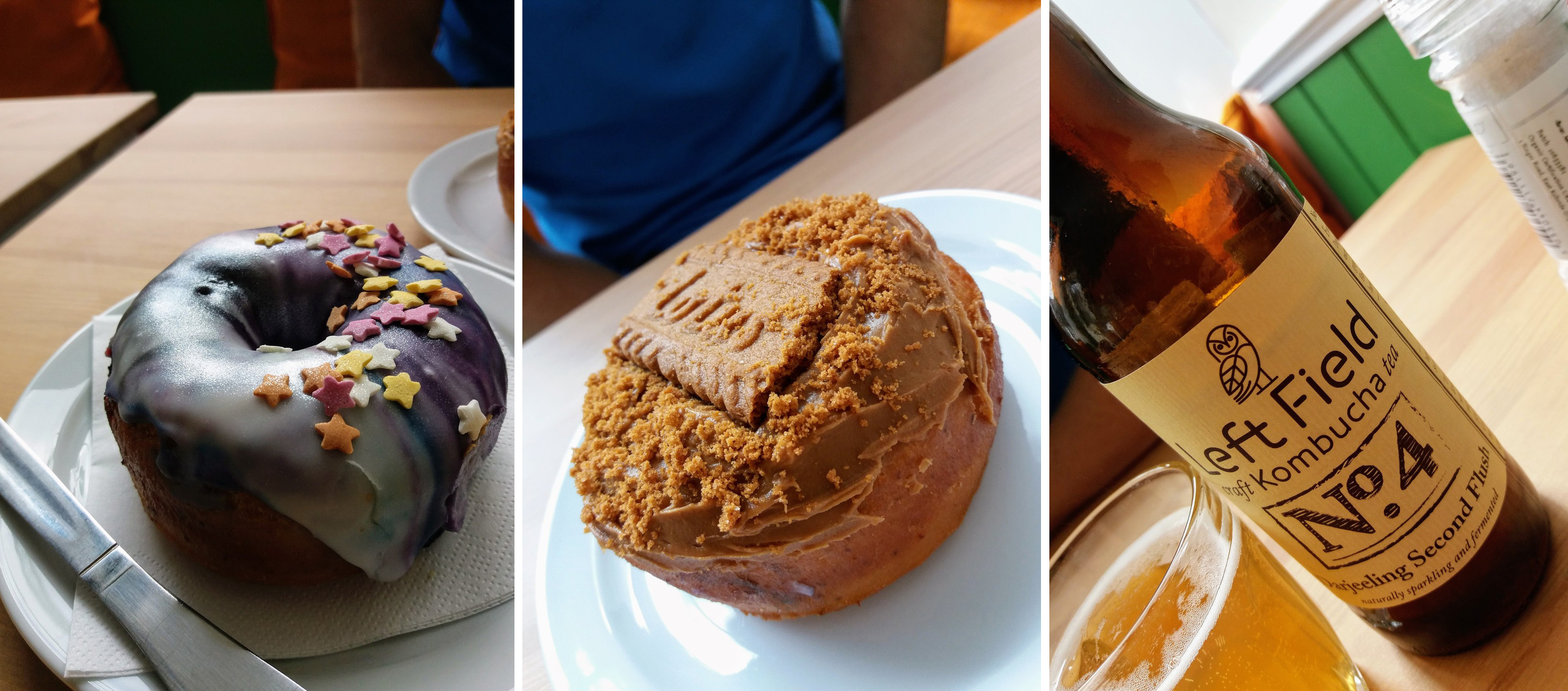Back to the food. We tried out the avocado and tomato on ciabatta and the BBQ pulled jackfruit ciabatta. Both were huge and stuffed with filling. We washed these down with kombucha, I had the Equinox raspberry and elderflower and Martin had Left Field No.4. Then as if we weren’t fit to burst we just had to have donuts and who can resist a donut with sparkles, I know I can’t! We also had the Lotus donut too, neither disappointed!!