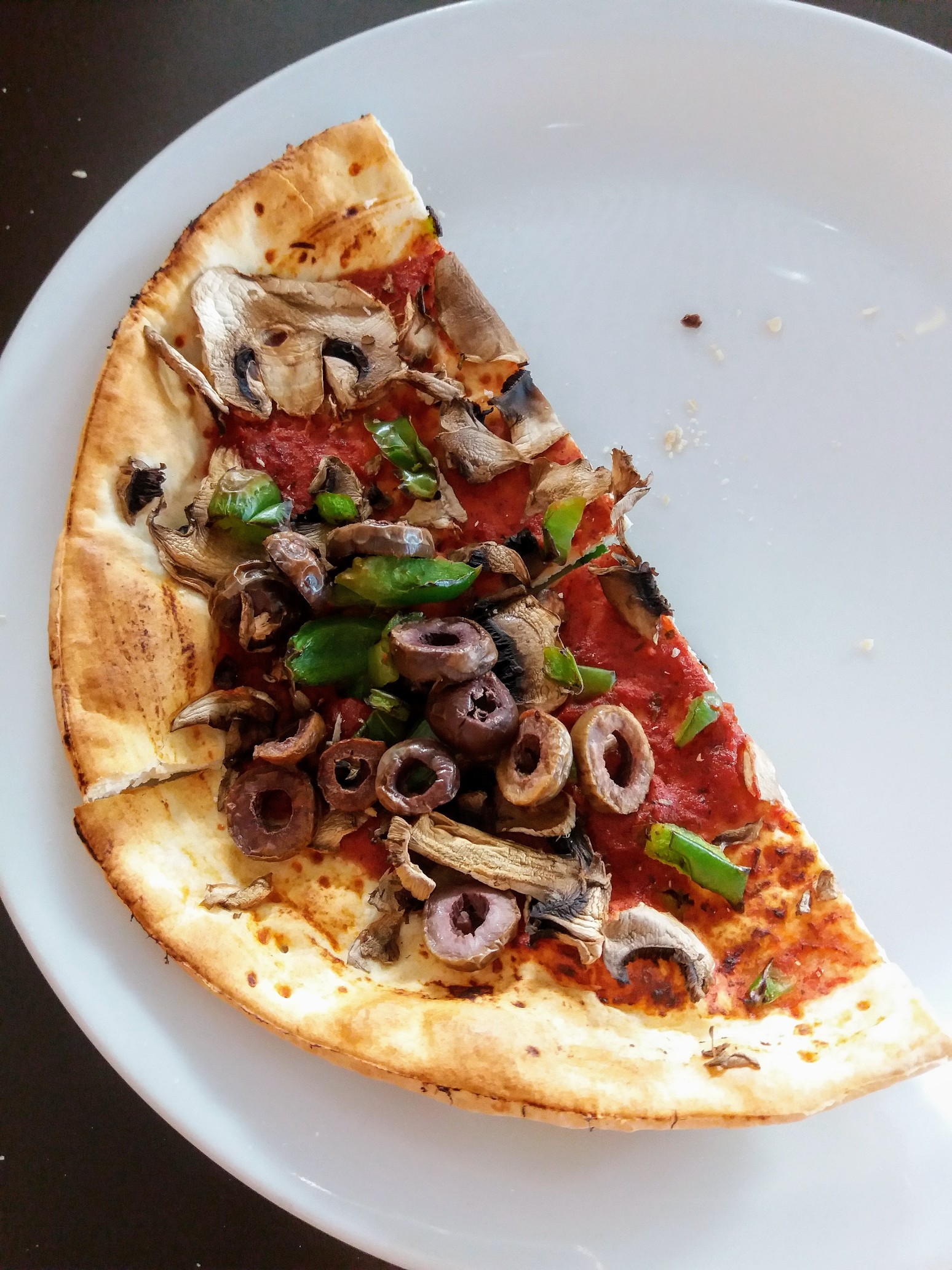 Like many pizza places, it’s easy to get a veggie pizza minus the cheese. (I’d actually eaten half before I remembered to take a photo!)