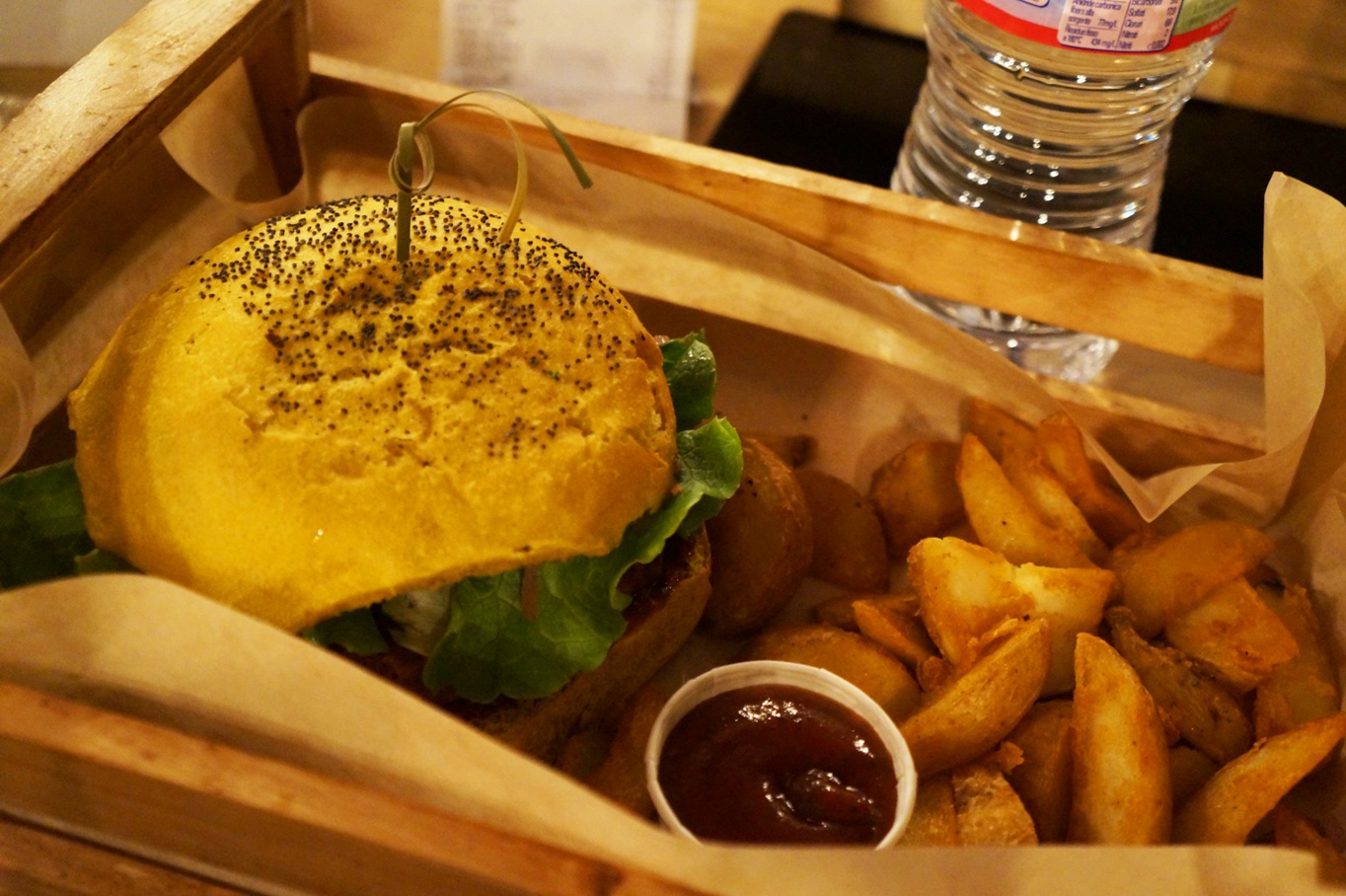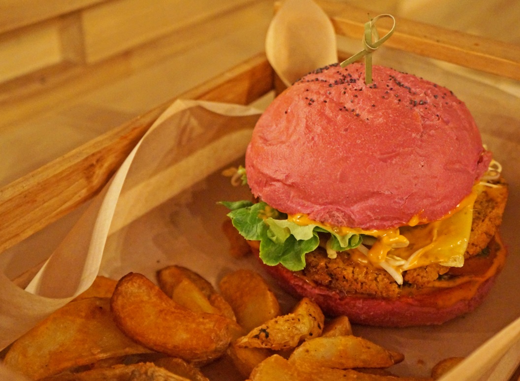 We had the good fortune of being there when the limited edition Cherry Bomb burger was on the menu, this is a tasty lentil burger, with tomato, green salad, sprouted beans, flower cheddar and salsa all served in a quirky pink bun. It’s so good, I had it twice (not on the same day, I’m not crazy – although I’d totally do it!) We ordered our burgers with a side of spicy wedges and spicy sauce to dip! (Excuse my pics, I took them in very low light and didn’t want to use the flash!)