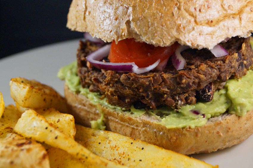 Veggie Haggis Burgers with Guacamole and Paprika Spiced Wedges (vegan & gluten free)