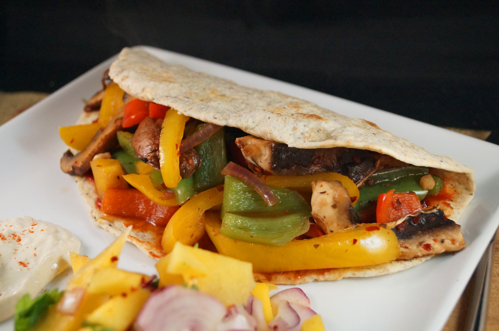 To assemble, lay out your flat bread, spread over a little of the tomato paste and thyme, spoon on a generous serving of the filling, add in the jalapenos, fold the bread over and serve with the mango salsa and some hummus or guacamole if you have any ripe avocados!